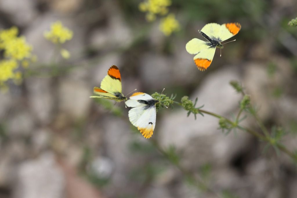 Anthocharis euphenoides - Weibchen in "Abwehrstellung" umgeben von Männchen...