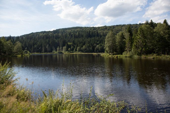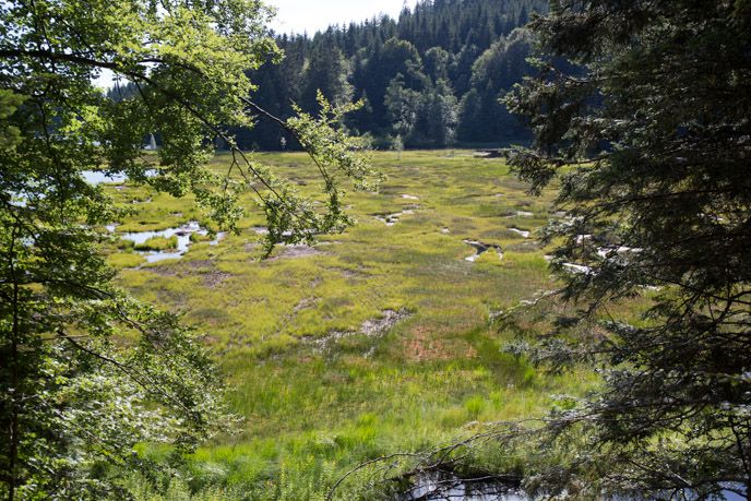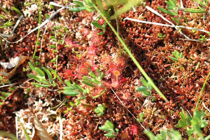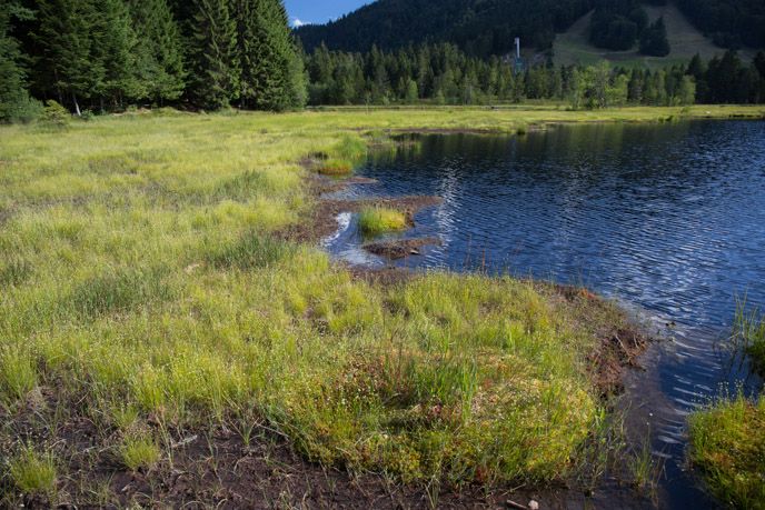 Verlandungszone des Sees. Die dunklen/rötlichen Stellen sind Bestände von Sonnentau.