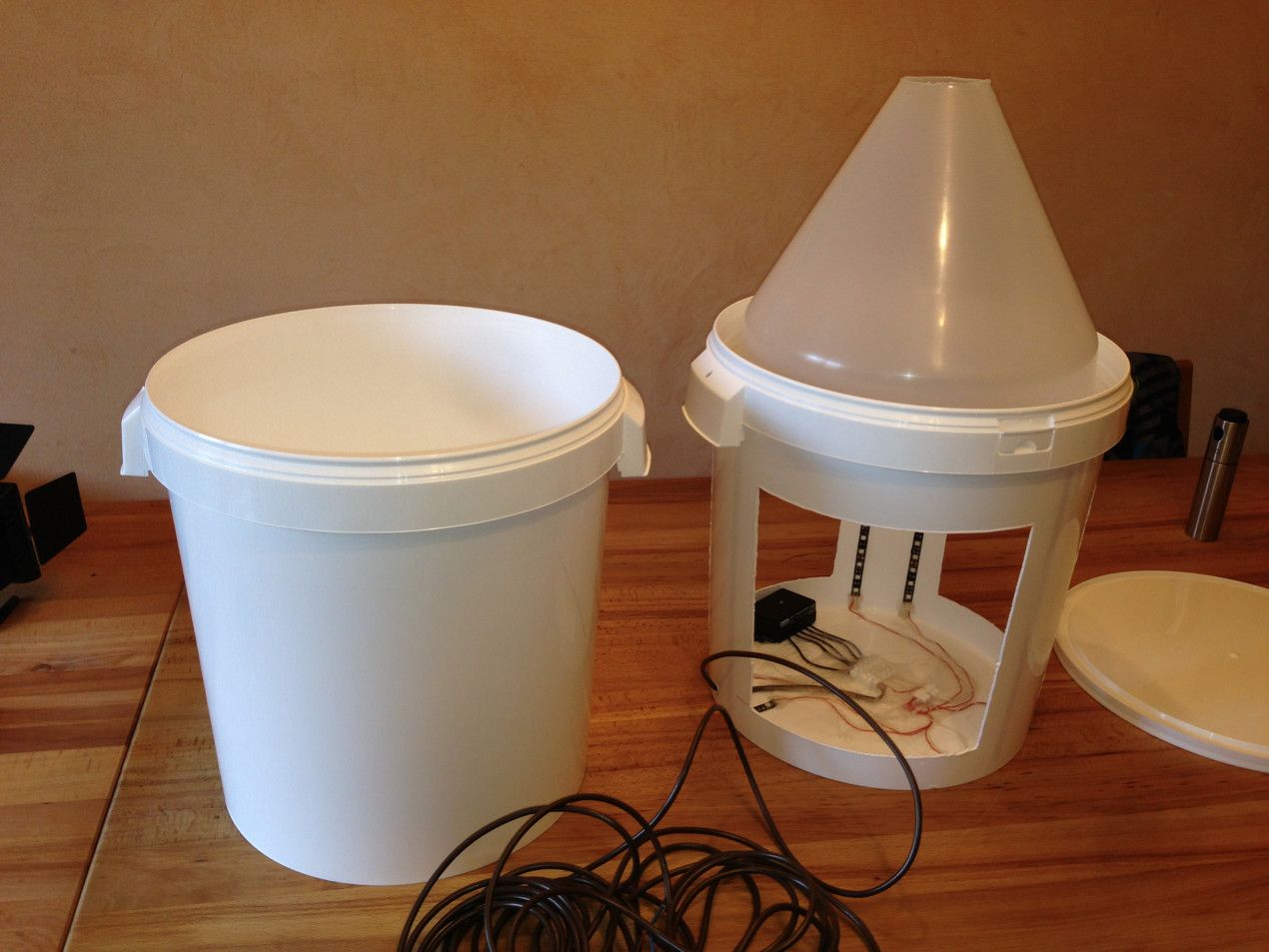 Voilà! Eine Lichtfalle! Es fehlen noch die Klammern, um beide Eimer miteinander fest zu verbinden. Die Beleuchtung ist mit ein Schwarzlicht LED-Streifen (12V) realisiert. Diese besitzen 8W/Meter. Für diese Anlage habe ich 6 Streifen je 30cm...