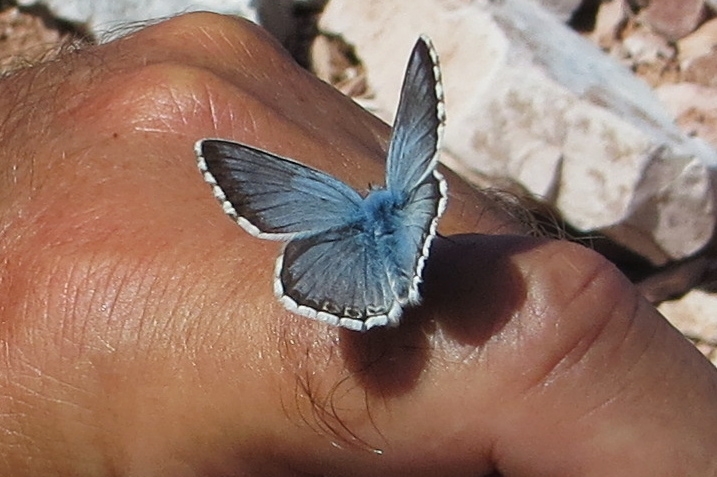 Bin nich informiert, den Bläuling da beim Vornamen zu nennen, der sich von meinem Begleiter Minuten lang mittragen ließ - Weg auf den Monte Baldo