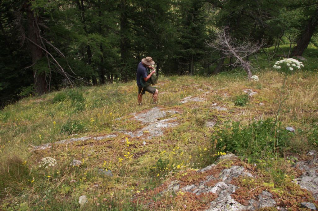 Das reich mit Sedum album bestandene Larvalhabitat über teils freiliegendem Fels.