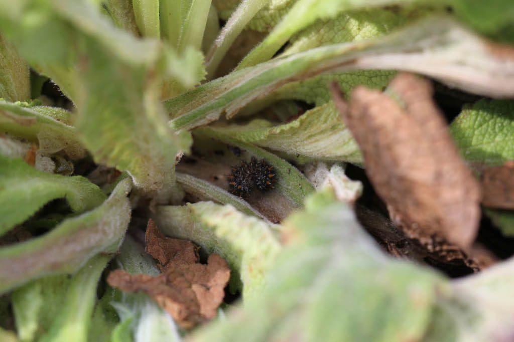 Die Raupe ist in der Bildmitte schon zu erkennen. Anders als die kleinen Räupchen sitzt diese fast erwachsene Raupe nicht im Horst, sondern oben auf der Pflanze.