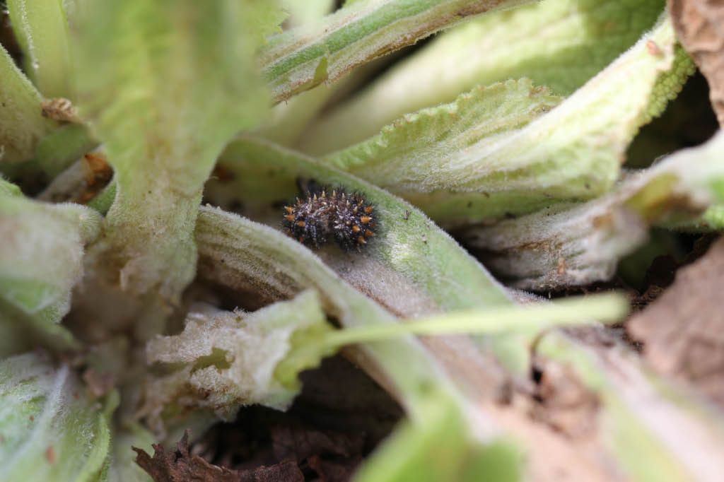 Räupchen M. athalia (zusammengerollt) in der Bildmitte.