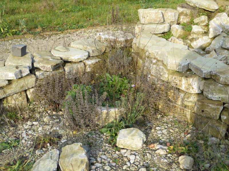 Aspekt an der Kalksteintrockenmauer am 19.12.2015: Die letzte Skabiose blüht und das Kraut der Skabiose wirkt saftig und frisch.