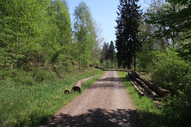Patrouillenweg von B. euphrosyne. So licht ist unser Wald selten und auch die Altersstruktur der Bäume hier ist einzigartig im Warndt. Hier stehen junge Birken neben uralten Fichten und Eichen. Dazwischen sind Lichtungen und - schön dass es so ist - Windwurfflächen. Gerne nutzt der Forst die Buchten, um dort Holzstämme zu lagern. Entstehen die Buchten zu diesem Zweck, so ist das wirklich zu begrüßen! Würde der Forst es jetzt noch schaffen, die Schotterung und das Ausräumen der Wegränder nicht so radikal zu gestalten, wie an den Fischbacher Stellwegen geschehen, so wäre es ein ganz hervorragende Beispiel für naturnahe Waldwirtschaft.