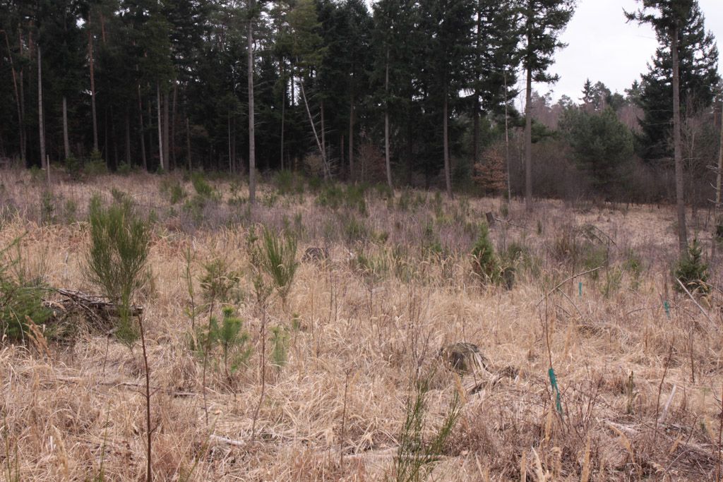 Larvalhabitat von Lasiocampa quercus auf einer Windwurffläche.