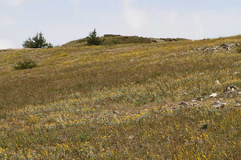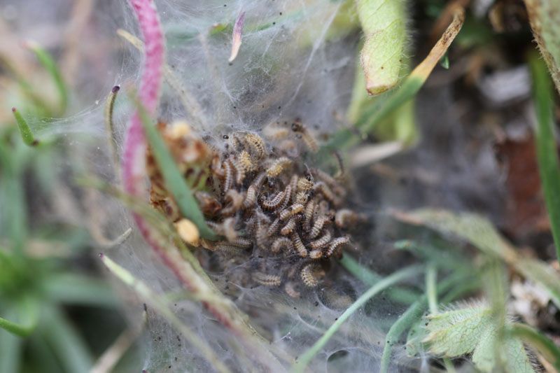 Diese kurzrasige Matte ist das Larvalhabitat. Die Raupennester fanden sich an Alpenwegerich (Plantago alpina)