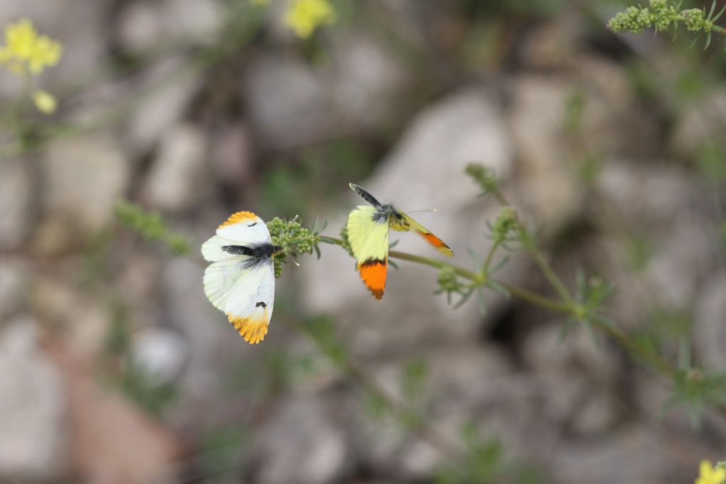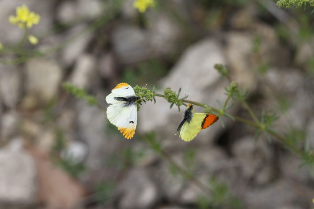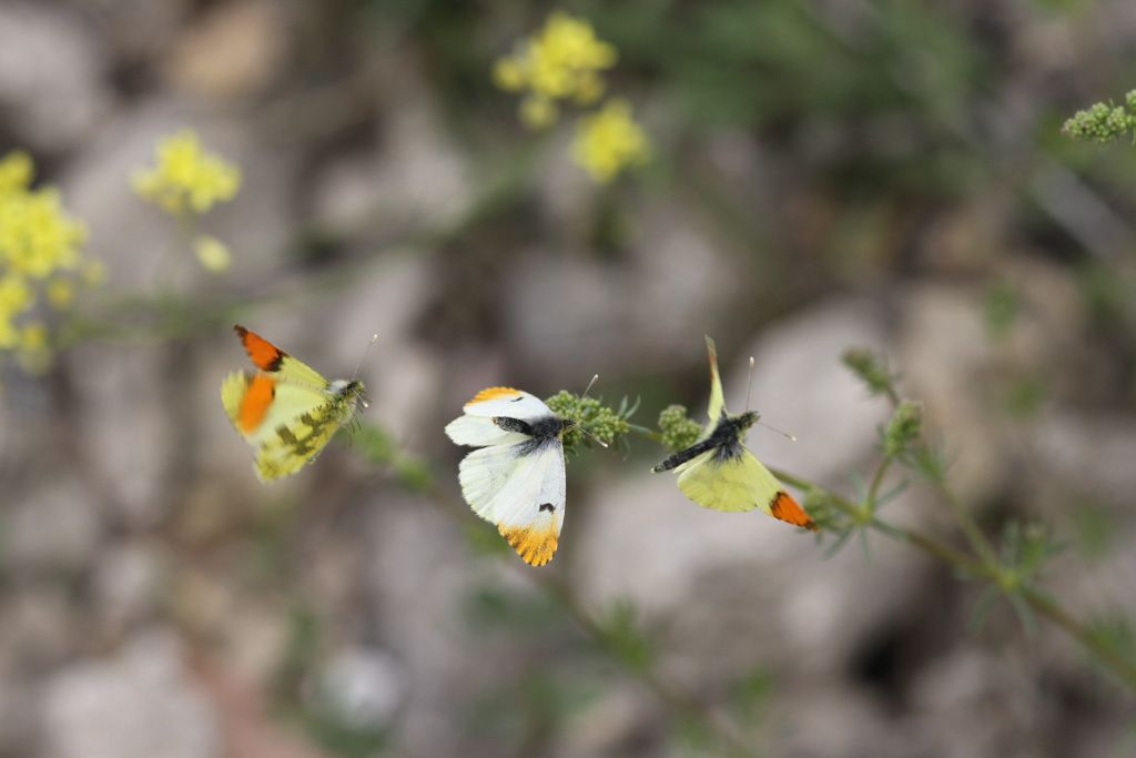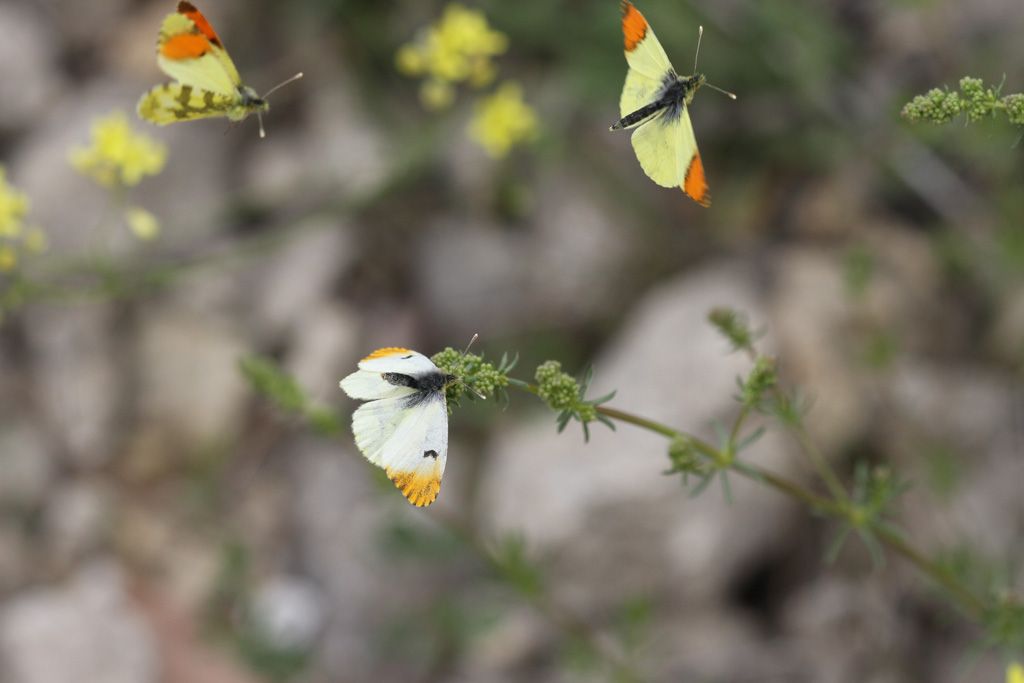Anthocharis euphenoides - Weibchen in "Abwehrstellung" umgeben von Männchen...