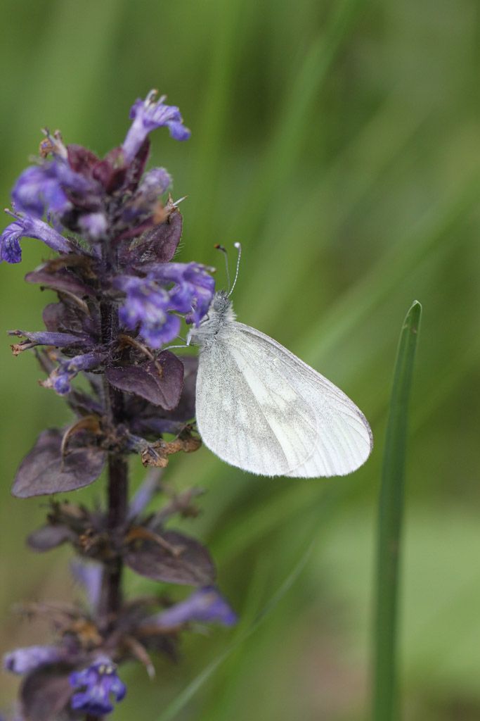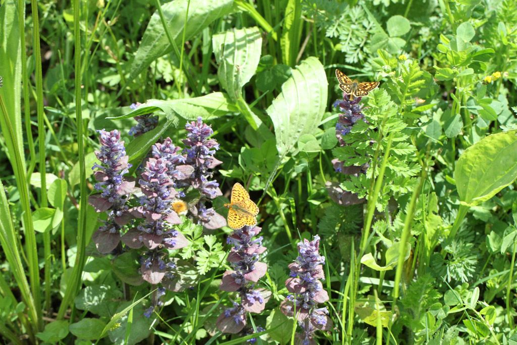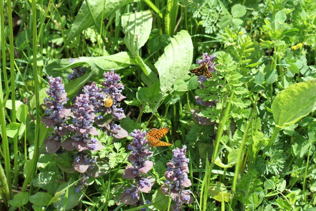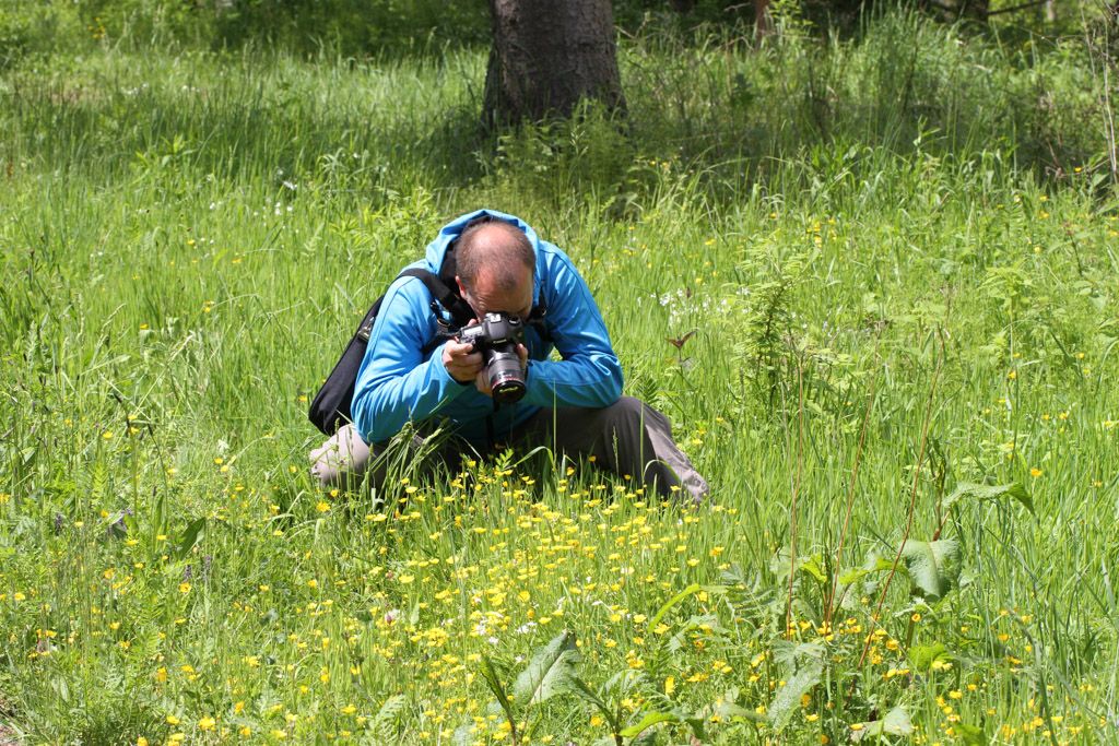 Entomologe (blau), Hahnenfuß (gelb), Kriechender Günsel und Silberfleck (unsichtbar) im Brennpunkt der Linse des Entomologen