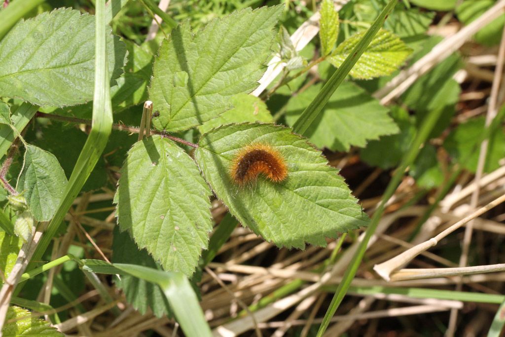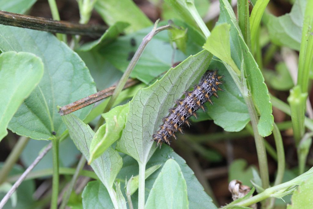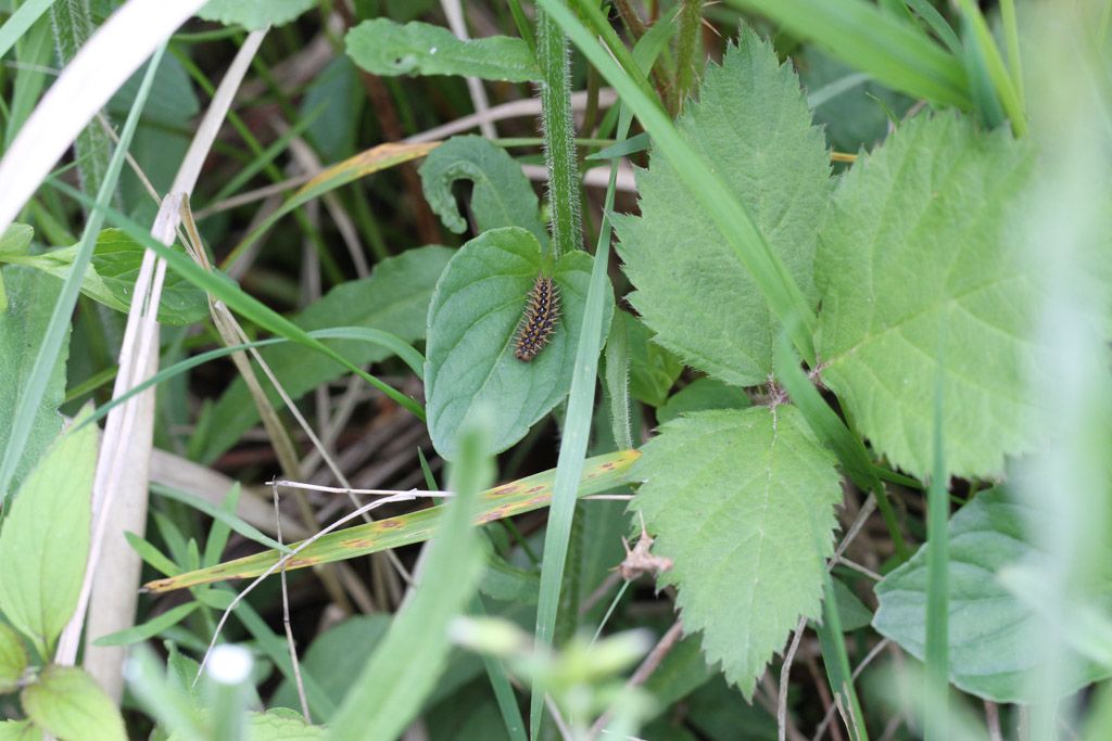 Raupe von Argynnis adippe, dem Feurigen Perlmuttfalter auf Viola riviniana.