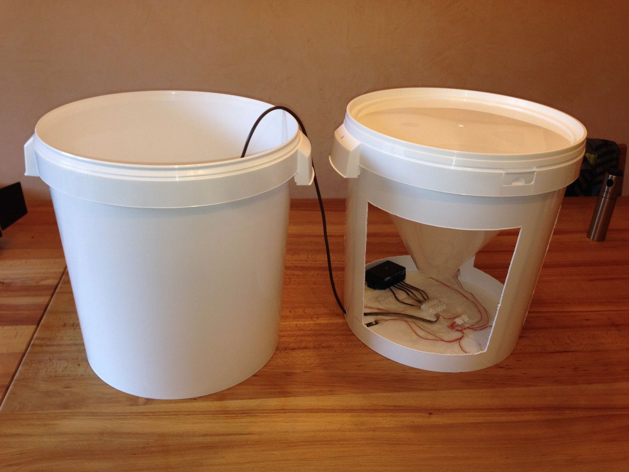 Der rechte Eimer hat ha drei Fenster und seltsame Kabel! Und da steckt ein Trichter drin! komisch... Was soll das werden, wenn es fertig ist?