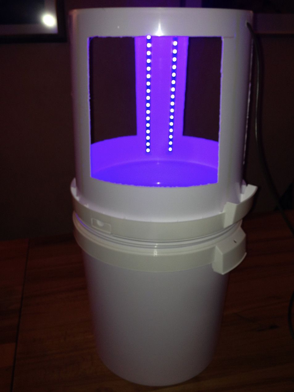 Voilà! Eine Lichtfalle! Es fehlen noch die Klammern, um beide Eimer miteinander fest zu verbinden. Die Beleuchtung ist mit ein Schwarzlicht LED-Streifen (12V) realisiert. Diese besitzen 8W/Meter. Für diese Anlage habe ich 6 Streifen je 30cm...