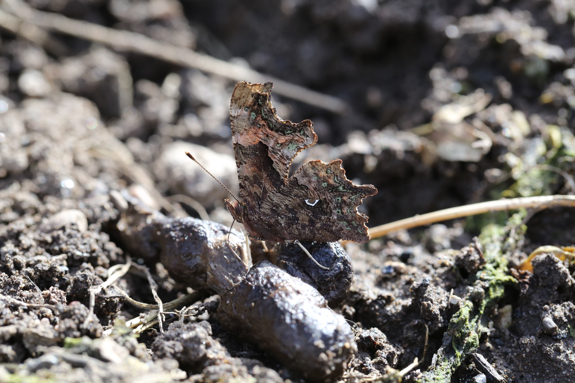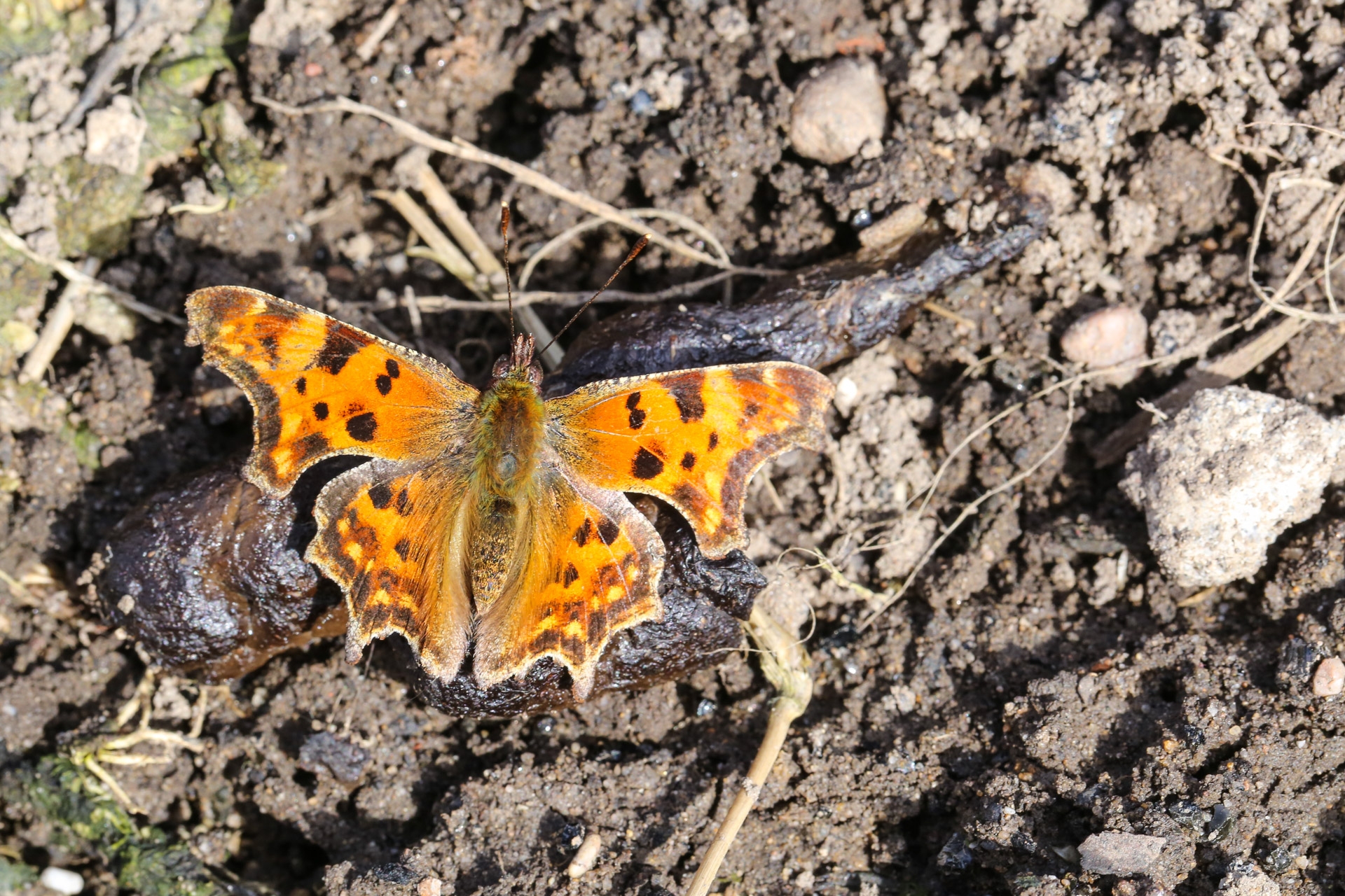 Über Geschmack lässt sich streiten. Ein Stückchen Fuchskot ist aber für diesen C-Falter das Nonplusultra des Geschmackserlebnisses. Eine Weile haben sich drei Falter um dieses Prachtstück gestritten.