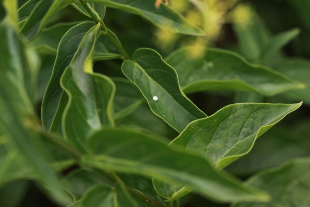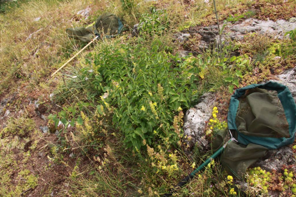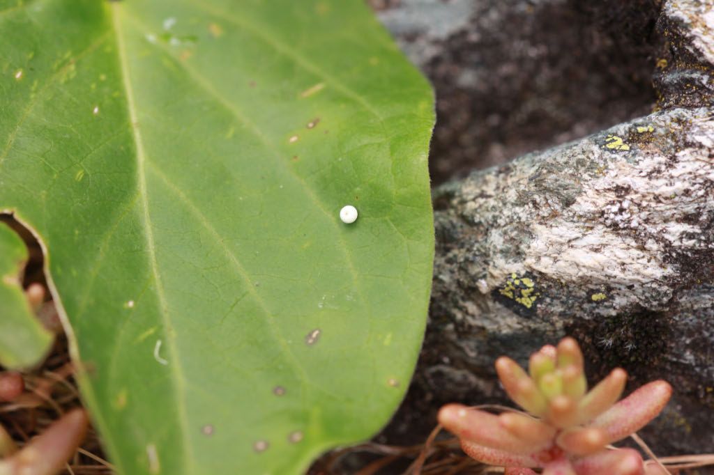 Man erwartet die Eiablage an Sedum album, doch tatsächlich werden die Eier unter anderem hier an den noch grünen Blättern abgelegt.