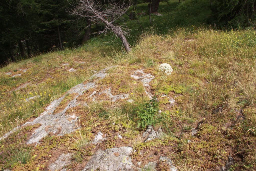 Das reich mit Sedum album bestandene Larvalhabitat über teils freiliegendem Fels.